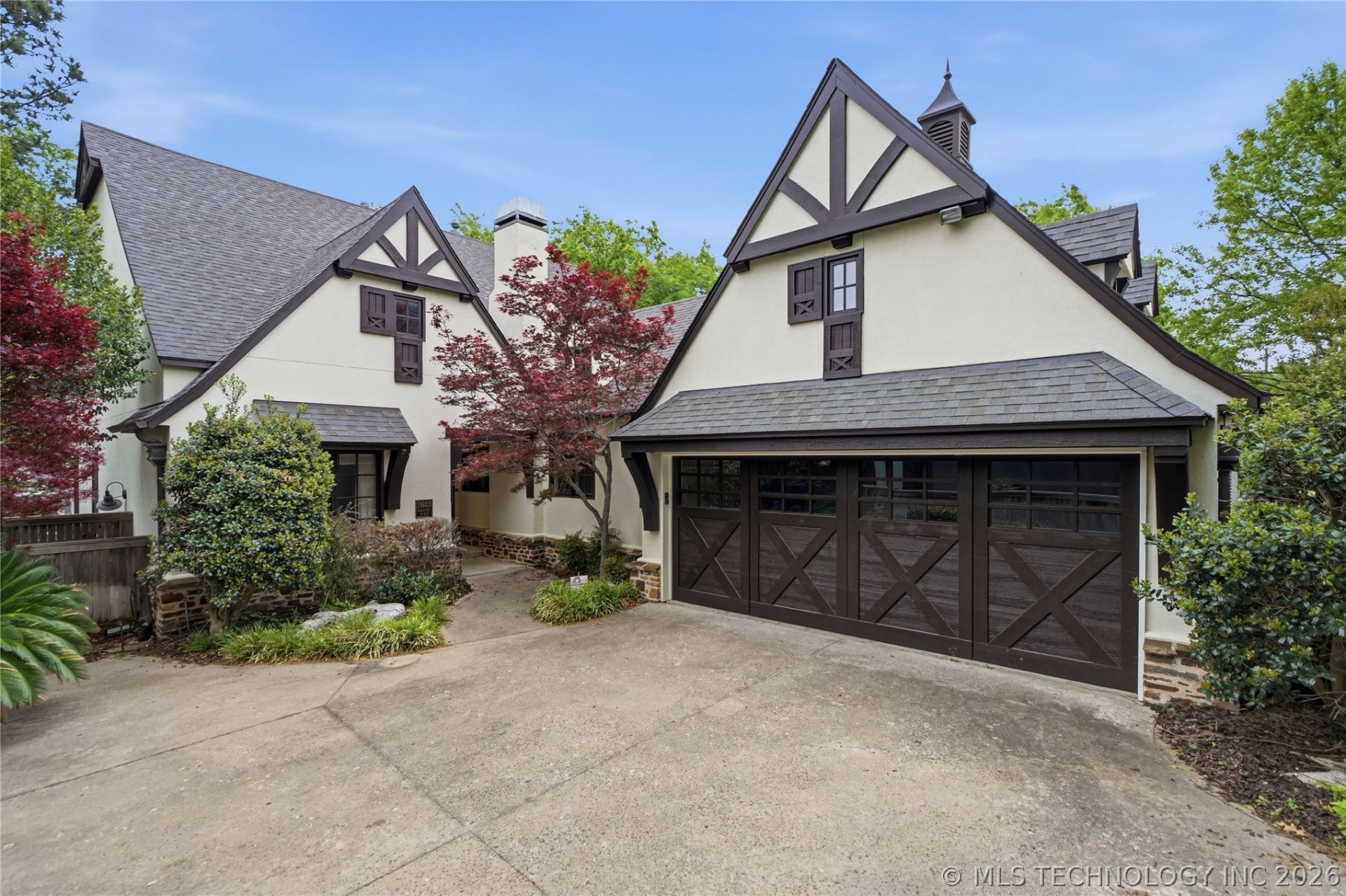 Lovely English-style home near Utica Square, St. John Hospital, Monte Cassino School, and Cascia Hall. This home offers many, charming design details and updates inside and out. NEW ROOF SPRING 2026. Spacious great-room with beamed, and cathedral ceiling, cast-stone fireplace. Vaulted kitchen and sitting area with stacked stone fireplace, plus walk-in pantry. First floor primary suite, plus guest bedroom or office with vaulted ceilings and wood-stained, paneled walls. Two additional bedrooms and gameroom with built-ins upstairs. Hardwood flooring throughout. Beautiful and private outdoor setting with terraced flagstone patios, covered patio, fireplace, gunite pool and spa.